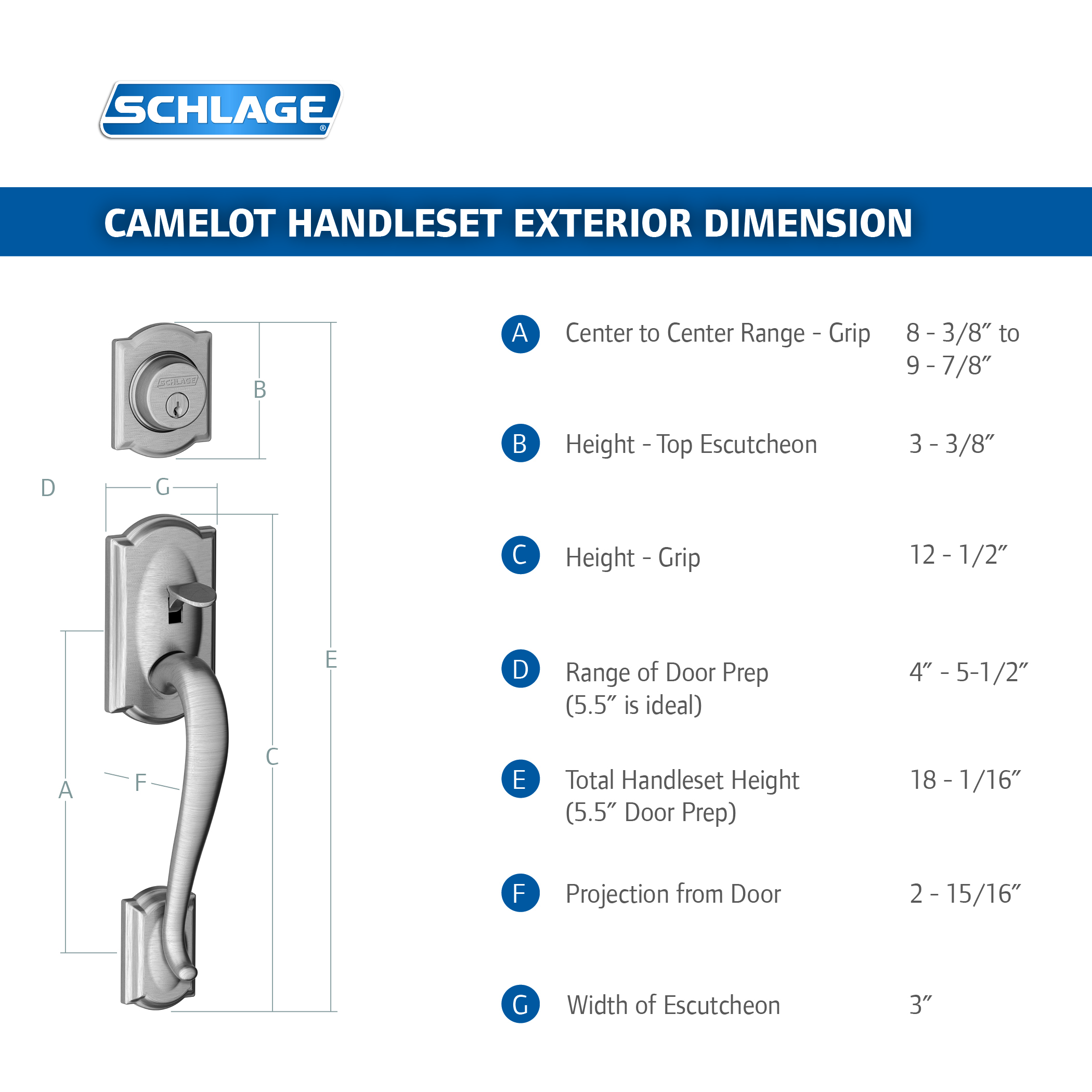 The distinctive design of the Camelot combines architectural inspired arches with graceful curves. All of Schlage's front entry door handlesets are precision-engineered, built with a rugged metal, and thoroughly tested to ensure maximum residential security. To make sure they complement their surroundings, there are a wide variety of designs and finishes from angular to flowing, classic to contemporary.