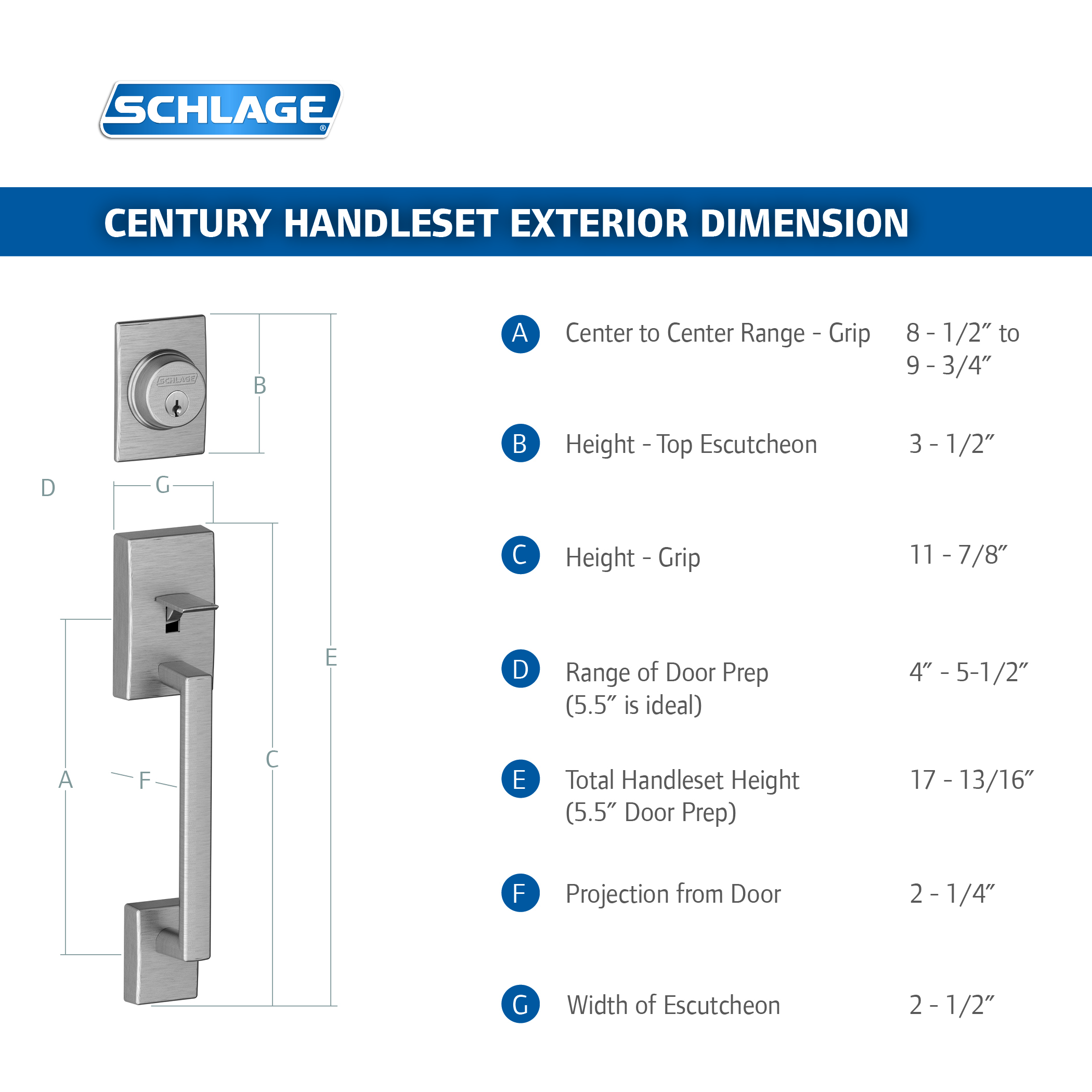 Inspired by the clean lines of the modern movement, the Century is an excellent choice for the contemporary home. It combines elegant styling with the best security you can buy. All of Schlage's front entry door handlesets are precision-engineered, built with a rugged metal, and thoroughly tested to ensure maximum residential security.