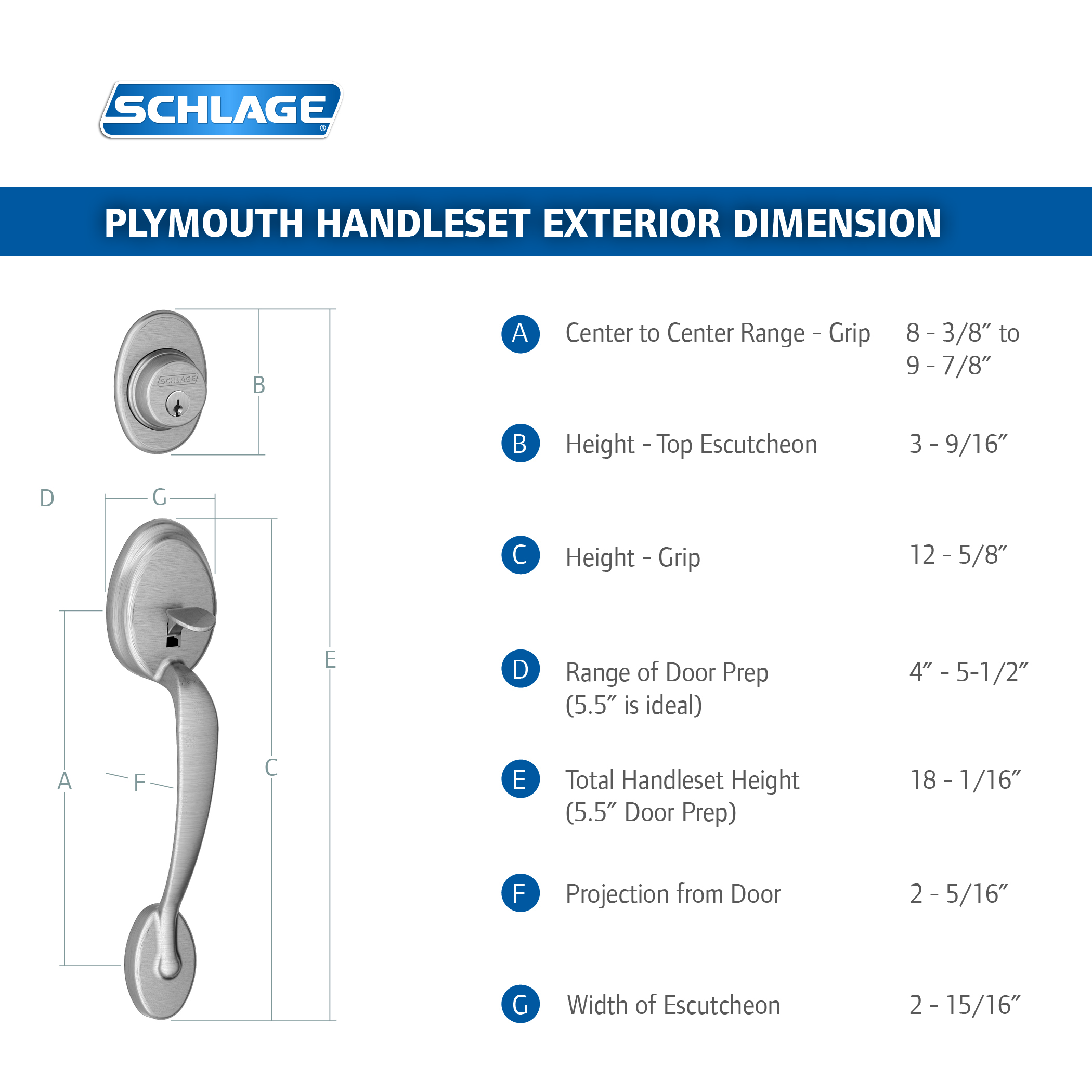 The timeless design of the Plymouth works with any style in any room of your home. All of Schlage's front entry door handlesets are precision-engineered, built with a rugged metal, and thoroughly tested to ensure maximum residential security.